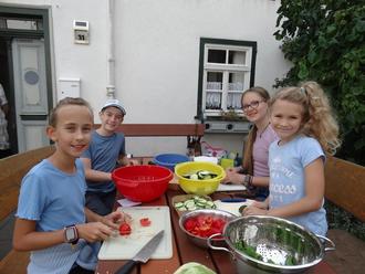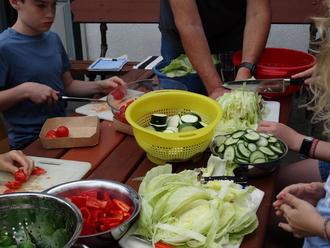 Die Kinder wurden durch Losverfahren in 3 Gruppen für das Schnibbeln, Dressing und Spieße erstellen und für den Nachtisch aufgeteilt. Unter der Aufsicht und Mithilfe von Margaret Halwe, Regina Scharkowski, Gerd Ringsdorf, Achim Scharkowski und Günter Succo wurde geschält, geschnippelt, gehackt, gerührt, gewürzt und abgeschmeckt. Marianne Weiser unterstützte die Nachspeisegruppe.
