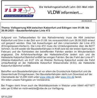 Aufgrund von Tiefbauarbeiten für das Nahwärmenetz muss die K64 zwischen Katzenfurt und Sinn in der Zeit vom 01.09. bis voraussichtlich zum 26.09.2025 erneut voll gesperrt werden. Dies hat Auswirkungen auf den Linienverkehr der Linie 472 (Ehringshausen-Herborn). Die Linie 472 muss die Umleitungsstrecke über die B277 nehmen. Es tritt wieder der Baustellenfahrplan in Kraft (wie bei der ersten Sperrung im Februar) und die Fahrtzeiten der betreffenden Fahrten werden im Minutenbereich angepasst. Die Anfahrtsreihenfolge der Haltestellen/Orte ändert sich und die Haltestelle Katzenfurt Bahnhof entfällt bei einigen Fahrten. Bei der Fahrt der Linie 471 (Wetzlar-Katzenfurt) um 6:27 Uhr ab Wetzlar Richtung Katzenfurt endet die Fahrt umlaufbedingt an der Haltestelle Katzenfurt Wiesenstraße (6:53); die Haltestelle Katzenfurt Bahnhof entfällt.