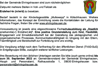 Ihre Bewerbung mit den üblichen Unterlagen senden Sie bitte (auch gerne online) bis zum 30. September 2022 an: Gemeindevorstand der Gemeinde Ehringshausen, Haupt- und Personalamt, Rathausstraße 1, 35630 Ehringshausen bzw. personalamt@ehringshausen.de.