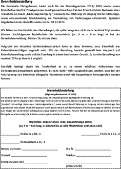 Wir bitten um Verständnis, dass Bestellungen, die später eingehen, nicht mehr berücksichtigt werden können. Nachfolgender Bestellschein für Industrieholz (ca. 4 m - 6 m lang) ist bei der Gemeindeverwaltung, Zimmer 14, einzureichen.
