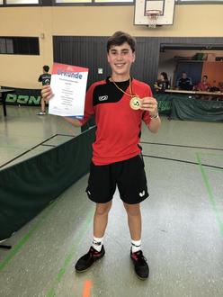 Bei den Tischtennis-Kreismeisterschaften in der Sporthalle Schwalbach war Luis Manfred Huck, Schüler der Johannes-Gutenberg-Schule in Ehringshausen, nicht zu stoppen. Der 13-jährige Spieler des SC Waldgirmes konnte sowohl einen Sieg in der Jugend 15 als auch in der Jugend 19 einfahren. Luis gewann die Spiele im Einzel und im Doppel und sorgte mit seinen technisch beeindruckenden Spielzügen für Aufsehen. So lag es auf der Hand, dass er sich auch den Entscheidungen im Erwachsenenbereich stellte. Auch da war Luis in herausragender Form. Er konnte in der offenen Klasse erfolgreich Silber gewinnen und war am Ende des Tages sehr zufrieden mit seiner Leistung. „Dass ich gut in Form bin, das wusste ich. Aber dass ich heute mit sechs Medaillen, viermal Gold und zweimal Silber, nach Hause gehen kann, freut mich sehr“, äußerte sich Luis nach seinen Spielen.