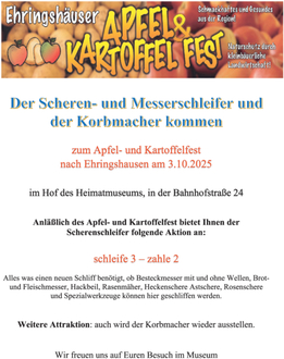 Anläßlich des Apfel- und Kartoffelfest bietet Ihnen der Scherenschleifer folgende Aktion an:
