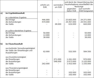 | erhöht um EUR | vermindert um EUR | und damit der Gesamtbetrag des Haushaltsplanes einschließlich der Nachträge | |