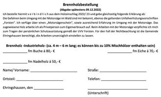 Wir bitten um Verständnis, dass Bestellungen, die später eingehen, nicht mehr berücksichtigt werden können. Nachfolgender Bestellschein für Industrieholz (ca. 4 m - 6 m lang) ist bei der Gemeindeverwaltung, Zimmer 14, einzureichen.