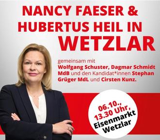 Im Endspurt zur Landtagswahl am Oktober kommen Bundesarbeitsminister Hubertus Heil und die Bundesinnenministerin und SPD-Spitzenkandidatin Nancy Faeser nach Wetzlar. Am