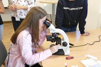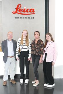 Leica würdigte mit dieser großzügigen Spende die sehr gute Zusammenarbeit zwischen der Schule und dem Unternehmen. Denn gerade nach dem schulischen Ausbildungsweg schlugen einige JGS`ler den beruflichen Weg zum Global Player aus Wetzlar ein. So war es auch keine Überraschung, dass Schulleiterin Annegret Schilling, Biologiefachbereichsleiterin Simone Strauß-Schwabe und MINT-Koordinator Marc Schäm eine ehemalige Schülerin im Werk begrüßen konnten. Nach einer kurzen Präsentation von Leica Microsystems, den weltweiten Werkstandorten und den betrieblichen Ausbildungsmöglichkeiten wurde den dann das Mikroskop vorgestellt. Tubus, Objektrevolver und Tisch wurden genauestens erklärt, bevor die beiden Zehntklässlerinnen Lucia Tinz und Joline Kretschmer, die zu der Besuchergruppe aus Ehringshausen gehörten, einen Blick durch das Okular werfen konnten. Dabei konnten sie sehen, wie deutlich und tiefenscharf Exponate auf den Objektträgern zu erkennen sind. „So macht das Mikroskopieren wirklich riesigen Spaß“, waren sich beide abschließend einig. Denn mit physikalischen Prinzipien ist es möglich, durch einen Vergrößerungseffekt Objekte oder deren Struktur sichtbar zu machen, die mit „normalem“ Auge kaum oder auch gar nicht zu sehen sind. Das Auflösungsvermögen des menschlichen Auges braucht hierbei eine deutliche Unterstützung. „Und wo viel Technik im Spiel ist, muss man finanziell auch deutlich tiefer in die Tasche greifen. Nicht nur deshalb freuen wir uns, dass unsere Schule so hochwertige Mikroskope von Leica bekommt“, freut sich Schulleiterin Annegret Schilling und Biologiefachleiterin Simone Strauß-Schwabe ergänzt: „Damit können wir das naturwissenschaftliche Arbeiten noch mehr fördern, denn das Experimentieren ist die zentrale Methode naturwissenschaftlicher Erkenntnisgewinnung.“