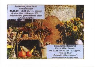 | 11.00 Uhr | Erntedankgottesdienst in der Jesus Christus-Kirche Dillheim mit den Stimmen „2001“, |