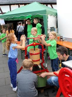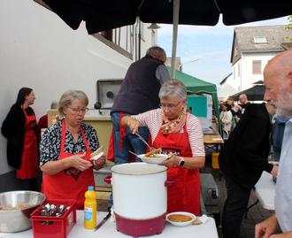 Das Apfel- und Kartoffelfest in Ehringshausen hat am Tag der Deutschen Einheit schon gute Tradition. In seiner 7. Ausfertigung war es zum ersten Mal in die Deutschen Nachhaltigkeitstage eingeschlossen und das Programm war noch breiter aufgestellt. Der Naturschutzring Ehringshausen (NRE) und die Gruppe "Senioren aktiv" konnten sich einmal mehr über eine hervorragende Resonanz freuen, hatten aber auch eine Menge zu bieten. Im und um den "Treffpunkt Bahnhofstraße" herrschte schon zu Beginn reger Betrieb. Die gute Kooperation und die Kreativität der Veranstalter hat sich längst in der Region herum gesprochen, die nicht zuletzt auf dem fruchtbaren Miteinander der Generationen fußt. Die beiden Vorsitzenden Helmut Weller und Rolf Westerhausen hießen herzlich willkommen. Sofort ins Auge fiel die Feldküche des CVJM an der Wilfried Faber wie immer das Regiment über die Erbsensuppe führte. Aber auch die zahlreichen "Wiesel" der so benannten NRE-Jugendgruppe waren überall zu finden. Sie verkauften Lose, waren mit dem Bauchladen unterwegs, pressten Apfelsaft, hatten ihre Werkstatt geöffnet und packten überall mit an. Dass es hier um mehr als nur essen und trinken geht, ist klar. Dem NRE um Helmut Weller ist sehr an der Erhaltung und Schaffung von Lebensräumen für Tiere und Pflanzen in der Region gelegen. Landschaftspflege wird aktiv in verschiedenen Projekten betrieben. Im Fokus steht die Bündelung der Naturschutzinteressen der Mitgliedsvereine und es wird eifrig in diesem Sinne Öffentlichkeitsarbeit durch Vorträge, Ausstellungen und Wanderungen betrieben. Entsprechend stellte sich das Angebot des Festes dar. Das in Sachen Nachhaltigkeit sehr ambitionierte Unternehmen "Junges Gemüse" aus Werdorf präsentierte zum ersten Mal seine Arbeit, hatte Kostproben von Aronia-Produkten dabei und jede Menge Informationen, insbesondere über den geplanten Lernbauernhof. Neu dabei auch die Landschaftspflegegemeinschaft Lahn-Dill e.V., die zum Beispiel wertvolle Infos gab, wie man als Privatperson kostenlos Hilfe zum Erhalt seiner Streuobstwiese bekommen kann - schließlich ist die Gemeinde Ehringshausen derzeit im entsprechenden Förderprogramm des Landes Hessen. Und auch die Herborner Gewürzküche präsentierte ihre Produkte und hatte als Neuling viel Betrieb. Mitten im Thema ist die Ehringshäuser Nachhaltigkeits-AG Mobilität, die Auskunft über umweltschonende Formen der Fortbewegung gab und mit ihren Kollegen aus Sinn das dortige Leihfahrradangebot vorstellte. Müßig, alle Aktivitäten aufzuzählen. Interessant war die Möglichkeit beim Pomologen Rolf Stoß aus Allendorf/Lumda die eigenen Apfelsorten bestimmen zu lassen. Wer kennt sich heute noch mit Apfelsorten wie der "Schafsnase", dem "Bonapfel" oder dem "Gacksapfel" aus? Der Milchschafhof "Wendeline" hatte Felle dabei, aber auch Käse aus Kuh- und Ziegenmilch. Bauer Böhm aus Dillheim stellte seine Produktpalette vor und auch die heimischen Imker waren vertreten. Der Kapellenverein hatte außerdem das Heimatmuseum geöffnet, wo ein Scherenschleifer gut zu tun hatte und auch ein Schmied sein Handwerk präsentierte. So mancher Besucher war überrascht, wie man sich direkt in der Nachbarschaft nachhaltig versorgen kann. Das Fest selbst war ein gutes Beispiel für Nachhaltigkeit, konnte man doch regional einkaufen, sich mit interessanten Informationen zu aktuellen Themen versorgen und Vereine und Anbieter kennen lernen, die gerne alle Fragen beantworteten. Und weil all das am besten in guter Gemeinschaft in geselliger Runde transportiert werden kann, gab es auch die Möglichkeit zum hinsetzen und genießen. Ob Erbsensuppe, Kartoffelpuffer, Wildbratwurst, Bio-Burger, Gemüsewaffel oder süße Waffel - überall konnte lecker gegessen und in froher Runde gelacht werden.