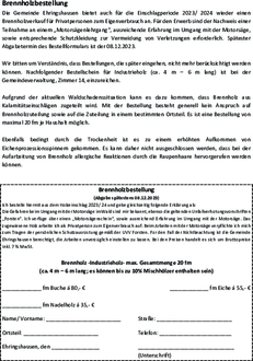 Wir bitten um Verständnis, dass Bestellungen, die später eingehen, nicht mehr berücksichtigt werden können. Nachfolgender Bestellschein für Industrieholz (ca. 4 m - 6 m lang) ist bei der Gemeindeverwaltung, Zimmer 14, einzureichen.