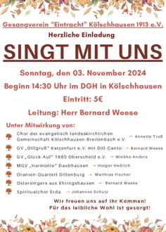 Eine Gelegenheit zum Kennenlernen und ein Angebot von verschiedenen Gesangsrichtungen werden sie als unsere Gäste, bei unserer Veranstaltung „Singt mit UNS“, am 03.November im Dorfgemeinschaftshaus in Kölschhausen haben.