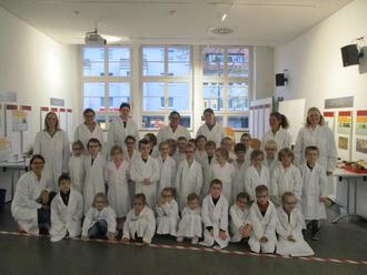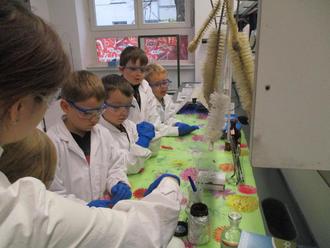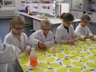 Die Kinder waren in zwei Gruppen aufgeteilt, die eine Gruppe experimentierte im Kinderchemikum und die andere Gruppe experimentierte zum Herbstmodul.