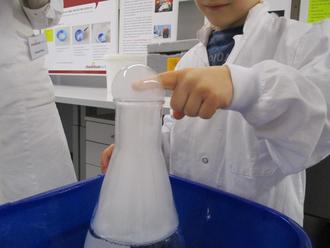 Im Kinderchemikum experimentierten die Kinder unter Anleitung von geschulten Assistentinnen und Assistenten. Spielerisch wurden Phänomene untersucht wie z. B.: „Warum wird der Kuchen fluffig, wenn man Backpulver zum Teig gibt?“ Oder „Was sind denn Gase?“