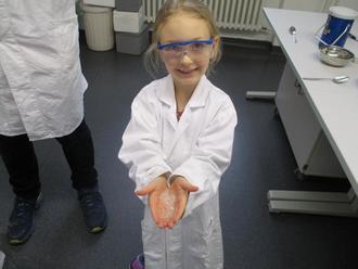 Bevor sie mit dem Experimentieren loslegen konnten, wurden alle mit einem Kittel und einer Schutzbrille ausgestattet.