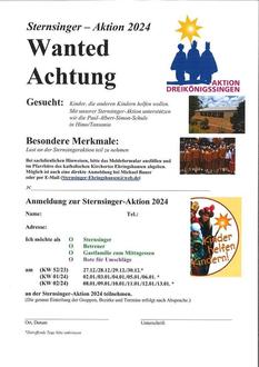 Im Anhang findet Ihr das Anmeldeformular für die Sternsinger-Aktion 2024. (Eine einfache Rückmeldung per Mail reicht ebenfalls.)