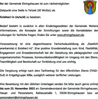 Ihre Bewerbung mit den üblichen Unterlagen senden Sie bitte (auch gerne online) bis zum 25. November 2022 an: Gemeindevorstand der Gemeinde Ehringshausen, Haupt- und Personalamt, Rathausstraße 1, 35630 Ehringshausen bzw. an personalamt@ehringshausen.de.