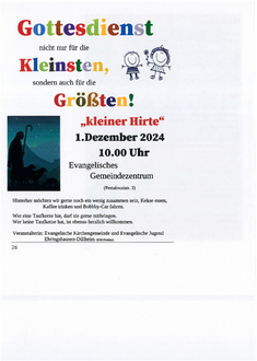 | 15.00 Uhr | Kindergottesdienst-Krippenspielprobe in der Jesus Christus-Kirche Dillheim |