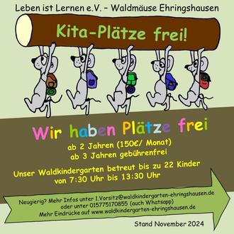 Jeden Tag draußen, mit der Natur wachsen und dabei liebevoll von erfahrenen Pädaogen begleitet werden... das geht bei den Waldmäusen in Ehringshausen! Dort sind auch aktuell noch Plätze frei. Die Kita betreut Kinder ab 2 Jahren für 6 Stunden täglich (7:30-13:30 Uhr). Ab 3 Jahren ist der Kita-Platz gebührenfrei. Wer Interesse an einem Kitaplatz hat, kann sich unter 1.Vorsitz@waldkindergarten-ehringshausen.de informieren.