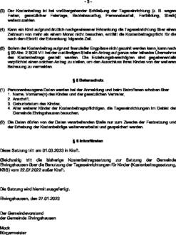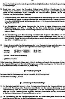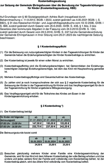 | (1) | Für die Betreuung von nutzungsberechtigten Kindern in den Tageseinrichtungen für Kinder der Gemeinde haben die Erziehungsberechtigten der Kinder Kostenbeiträge zu entrichten. |