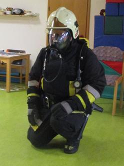 Herr Rummler erklärte an Hand der Schutzausrüstung wann diese und die Atemschutzmaske zum Einsatz kommen. In der Schutzausrüstung sah Herr Rummler, passend zu unserem jetzigen Thema, aus wie ein Astronaut.