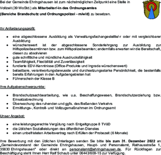 Ihre Bewerbung mit den üblichen Unterlagen senden Sie bitte bis zum 31. Dezember 2022 an „Gemeindevorstand der Gemeinde Ehringshausen, Haupt- und Personalamt, Rathausstraße 1, 35630 Ehringshausen“ oder direkt an personalamt@ehringshausen.de. Für Rückfragen zur Beschäftigung steht Ihnen Herr Ralf Schaub unter 06443/609-15 zur Verfügung.