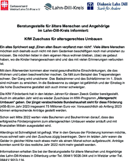 Informationen erhalten Sie bei der Beratungsstelle für ältere Menschen und Angehörige des Lahn-Dill-Kreises in Dillenburg unter Tel. 06441/ 9026-344 und in Wetzlar unter Tel. 06441/ 9013-114.