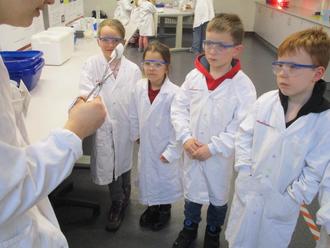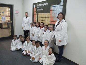 Bevor die kleinen Chemiker mit dem experimentieren anfangen konnten, mussten alle einen Kittel und Schutzbrille anziehen, damit die Augen, Haut und Kleidung geschützt waren.