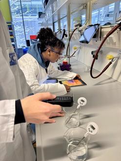 Nach ihrer Ankunft wurden die Schülerinnen und Schüler von Professorin Dr. Nicole Graulich aus dem Fachbereich „Didaktik der Chemie“ und ihrer Arbeitsgruppe herzlich empfangen und nach einer kurzen Einführung und den wichtigen Sicherheitshinweisen ging es dann direkt ins Labor. Ausgestattet mit Laborkitteln, Schutzbrillen und iPads mit Wärmebildkameras konnten die jungen Nachwuchsforscher dann selbst aktiv werden. In Partnerarbeit führten sie anschließend spannende und interessante physikalische sowie chemische Experimente durch.