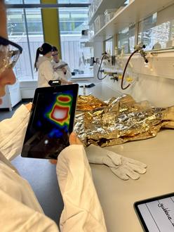 Mithilfe der Wärmebildkameras machten die Lernenden unsichtbare Temperaturveränderungen sichtbar und untersuchten alltagsnahe Fragestellungen, ob sich beispielsweise ein weißes oder ein schwarzes T-Shirt in der Sonne stärker aufheizt oder welche Seite einer Erste-Hilfe-Rettungsdecke im Ernstfall verwendet werden sollte. Die Experimente sorgten für großes Staunen, viel Freude und echtes Forschergefühl.