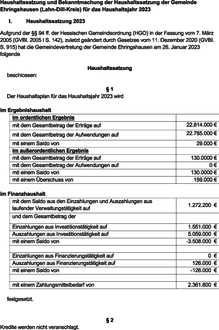 Aufgrund der §§ 94 ff. der Hessischen Gemeindeordnung (HGO) in der Fassung vom 7. März 2005 (GVBl. 2005 I S. 142), zuletzt geändert durch Gesetzes vom 11. Dezember 2020 (GVBl. S. 915) hat die Gemeindevertretung der Gemeinde Ehringshausen am 26. Januar 2023 folgende