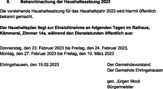 Die vorstehende Haushaltssatzung für das Haushaltsjahr 2023 wird hiermit öffentlich
