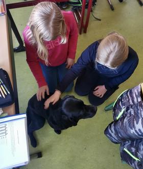 Anschließend steht noch der Lese-Rechtschreibkurs im Jahrgang 6 an und Emmi assistiert wieder einmal Deutschlehrerin Josepha Seger. „Emmi hat unentbehrliche Eigenschaften, wie Freundlichkeit und ihre Offenheit, und diese helfen, dass Schüler ihre Freude am Lesen und Schreiben finden können, wenn Emmi Anlässe dafür gibt. Außerdem hilft sie, die Motivation am Üben und Wiederholen zu verbessern, sodass die Schüler spielerisch und tiergestützt lernen. Hunde können zudem beim Lesen lernen und üben helfen, wodurch die Kinder ihre Lesefähigkeiten verbessern. Ein weiterer Nebeneffekt ist die Förderung von Rücksichtnahme, Selbstsicherheit und weiteren sozialen Kompetenzen“, fasst Seger die Lernerfolge zusammen. Und nach einem ausgefüllten Unterrichtstag gehen Zwei- und Vierbeiner zufrieden nach Hause.