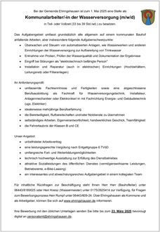 Für inhaltliche Rückfragen zur Beschäftigung steht Ihnen Herr Herr (Bauhofleiter) unter 06443/8189025 oder Herr Kreisz (Wassermeister) unter 0175/2625414 zur Verfügung, für Fragen zum Bewerbungsprozess Herr Rumpf unter 06443/609-24. Über Ehringshausen als Kommune und als Arbeitgeber, können Sie sich auf www.ehringshausen.de informieren.