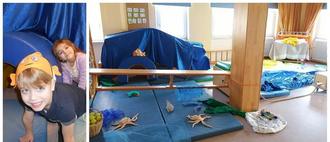 Ein bisschen weiter entfernt von dem Schatz lag eine Höhle tief unten im Meer, die erkundet werden musste. Auf dem Weg nach draußen, kämpften sich die Kinder durch dicke Algen, „tentaklige“ Kraken und bissige Haie. Später balancierten sie über eine schwindelerregend hohe Brücke und kletterten über ein Fischernetz oder eine Liane hinunter ins kühle Nass. Am Ende der Stunde sammelten die Kinder alle Schätze ein, die der Pirat zuvor verloren hatte.
