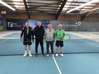 Am Samstag, dem 11.03.2023 fand um 18.00 Uhr in der Tennishalle bei schwarz-weiß Landau unser Rückspiel Herren 50 gegen die Herren aus Kapellen-Drusweiler statt. Das Hinspiel wurde mit 4:2 gewonnen. Unsere Zielsetzung war natürlich einen Sieg zu erringen. Die ersten beiden Spiele bestritten Peter Bößer und Peter Brennenstuhl. Auf blauem, sehr schnellem Bodenbelag erwischte Peter Bößer einen miserablen Tag und musste sich klar mit 1:6 und 0:6 geschlagen geben. Große Probleme mit seinem Gegner hatte auch Peter Brennenstuhl im ersten Satz und zu Beginn des Zweiten Satzes. Trotz eines 2:6 und 1:4 Zwischenstandes, schaffte er noch den Umschwung und gewann letztendlich den zweiten Satz mit 7:5. Im anstehenden Match Tiebreak setzte sich Peter mit 10:8 durch und holte den ersten Punkt. Die letzten beiden Einzel wurden von Thomas Diehl und Ulli Jochim gespielt. Auf einen wirklich hochklassischen sehenswerten ersten Satz, den Tom mit 5:7 abgeben musste, folgte ein kurzweiliger 2 Satz den Tom mit 1:6 verloren geben musste. Ulli hingegen beherrschte seinen Gegner in allen Facetten und ging mit 6:1 und 6:2 als Sieger vom Center Court. Bei einem Zwischenstand von 2:2 war für beide Mannschaften noch alles möglich. Jetzt wurden die Doppel aufgestellt. Das1. Doppel spielten Thomas und Ulli. Im 2. Doppel kämpften die beiden Peter. Nach einer fantastischen, fast fehlerfreien Vorstellung von Tom und Ulli, die ihre Gegner mit 6:1 und 6:2 deklassierten, folgte die Enttäuschung. Peter und Peter wurden vorgeführt und kamen nicht ins Spiel. Der Satz wurde mit 1:6 und 2:6 verloren. Endergebnis 3:3. Es hat trotzdem Spaß gemacht - nach dem Motto dabei sein ist alles!! (von PBre)