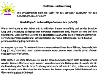 Die Ortsgemeinde Bellheim sucht für das Schuljahr 2023/2024 für den Schülerhort „IGLUS“ eine/n