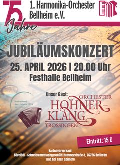 Das 1. Harmonika-Orchester Bellheim blickt auf sein 75-jähriges Bestehen zurück. Gefeiert wird das mit einem Konzert am 25. April in der Festhalle in Bellheim, Zeiskamer Str.