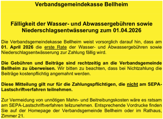 Die Verbandsgemeindekasse Bellheim weist vorsorglich darauf hin, dass am 1. April 2026 die erste Rate der Wasser- und Abwassergebühren sowie Niederschlagsentwässerung zur Zahlung fällig wird.