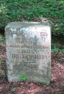 Ab ca. 11 Uhr führt Arno Kern als zertifizierter Wanderführer die Gruppe dann auf dem ca. 6 km langen „Friedrichsbühl-Rundwanderweg“. Eine erste Station ist das ehemalige Jagdschloss „Friedrichsbühl“ in ca. 1,5 km Entfernung. Vom ehemaligen Lust- und Wasserschloss des Kurfürsten Friedrich II sind heute nur noch die Abmessungen zu erkennen. Erhalten ist nur das ehemalige Renaissancetor als Zugang zum Schloss. Das Original aus dem 16. Jh. steht heute im Foyer des Historischen Museums der Pfalz in Speyer.