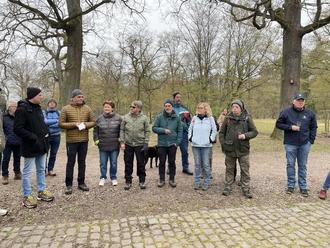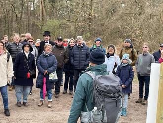 Auf der ersten von insgesamt 13 geführten Touren, organisiert durch den Südpfalz-Tourismus VG Bellheim e.V., folgte die Gruppe ab 11 Uhr dem Gästebegleiter Arno Kern auf dem ca. 6 km langen „Friedrichsbühl-Rundwanderweg“. Am ersten Stopp, nur wenige hundert Meter vom Ausgangspunkt entfernt, stellte er drei Pflanzfelder vor, auf denen nur wenige Tage vorher Bellheimer Kindergartenkinder über 400 Bäume gepflanzt hatten. An jedem Baum erinnert ein Namensschild an das jeweilige Kind. So können die Bäume zusammen mit den Kindern groß werden. Die Pflanzaktion, durchgeführt durch Landesforsten mit dem PWV ist ein gefördertes LEADER-Projekt, ebenso wie die neue „Erlebnisstation Friedrichsbühl“, dem nächsten Stopp auf der Wanderung.