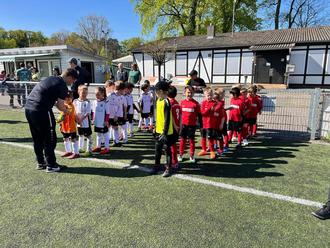 Die G-Jugend (Bambini-Mannschaft) des FC Phönix Bellheim (im rot-schwarzen Dress) beim Einlauf zum Spiel beim FC Bienwald Kandel!