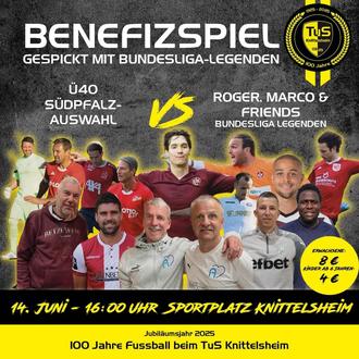 Am 14.06. um 16:00 Uhr rollt der Ball auf dem Sportplatz in Knittelsheim. Das Team Roger Lutz, Marco Kurz und Friends spielt an dem Tag gegen eine Südpfalz-Auswahl, welche von Julian Hübner trainiert wird. Mit dabei sind Spieler wie Florian Dick, Sidney Sam, Srdjan Lakic, Tobias Sippel und viele mehr. Lasst euch überraschen