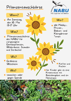 Die von den NABU Gruppen der VG Bellheim und Lingenfeld gemeinsam ausgerichtete Aktion erfolgt im jährlichen Wechsel zwischen den beiden Verbandsgemeinden. Nachdem die Pflanzentauschbörse 2024 in Zeiskam ein voller Erfolg war, wird die Tauschbörse in diesem Jahr am Samstag, den 10. Mai von 13:00 Uhr bis 17:00 Uhr in der Grillhütte Westheim ausgerichtet.
