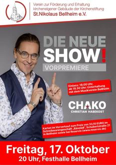 So präsentiert Chako am Freitag, 17. Oktober 2025, 20:00 Uhr, in der Festhalle, bei einer Vorpremiere, sein brandneues Solo-Programm „Die neue Show!“.