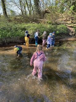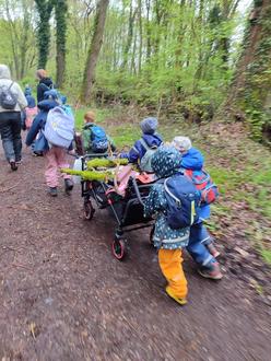 Ein Teil der Gruppe konnte im Bach die unterschiedlichen Bodenbeschaffenheiten erkunden. Wir suchten nach Flusskrebsen, fanden leider keine, konnten aber viele Wasserläufer und Muscheln entdecken. Diese Woche war voller spannender Erlebnisse und Lernmöglichkeiten, die die Kinder begeistert haben. Den letzten Tag der Waldwoche konnten wir bei strahlendem Sonnenschein genießen. Wald, Bach und Wiese wurden noch einmal besucht und so lernten wir auch einen Lederlaufkäfer kennen, den wir gemeinsam unter einer Wurzel entdeckten. Es war beeindruckend zu sehen, wie sich die Kinder mit natürlichen Materialien auseinandersetzen und dabei kreativ wurden.