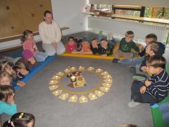 Anschließend sang der für die Adventsfeier gegründete Eltern/Erzieherchor das Lied „Sterne an den Fenstern.“ Ein herzliches Dankeschön an die Eltern, die sich bereit erklärt haben mit uns zu singen und den Gottesdienst mit diesem Beitrag zu verschönern. Nach dem „Segen“ und dem „Vater Unser“ durch Pfarrer Gutting beendeten die Kinder mit dem Lied „Ich schenk dir einen kleinen Stern“ unsere kleine Adventsfeier. Im Anschluss an die Feier wurde noch zu Glühwein, Kinderpunsch und Plätzchenessen eingeladen. Auch hier einen ganz herzlichen Dank an den Elternausschuss, der so liebevoll die Organisation und die Dekoration übernommen hat. Nach unserer Feier gingen dann alle mit ihren, von den Kindern selbst gebastelten Adventslichter, nach Hause.