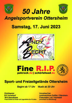 Im Jahr 1973 wurde der Angelsportverein Ottersheim gegründet. Das 50jährige Vereinsjubiläum soll natürlich gefeiert werden. Am Samstag, 17. Juni 2023, steigt auf dem Sport- und Freizeitgelände Ottersheim die Geburtstagsparty. Los geht’s um 17 Uhr. Um 18 Uhr findet eine kurze Begrüßung und die Ehrung von Vereinsmitgliedern und treuen Unterstützern des Angelsportvereins statt.
