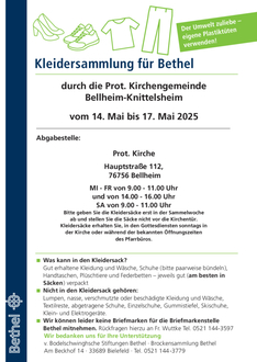 Die diesjährige Frühjahrs-Sammlung findet von Mittwoch, den 14. Mai bis Samstag, den 17.05.2025 statt. Die Kleidersäcke können an diesen Tagen jeweils von 09:00 bis 11.00 und Mittwoch bis Freitag außerdem von 14:00 bis 16:00 Uhr in der Prot. Kirche Bellheim, Hauptstr. 112 abgegeben werden. Bitte stellen Sie keine Säcke außerhalb der Öffnungszeiten ab.