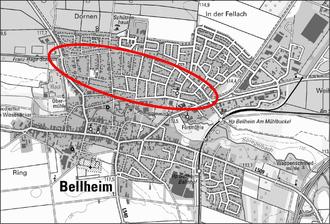 Das Plangebiet umfasst ca. 1/3 der nördlich des Ortskerns und des Schulzentrums gelegenen Wohnbaugebiete der Ortsgemeinde Bellheim. Die insgesamt 33,9 ha große Fläche erstreckt sich zwischen der Postgrabenstraße im Norden und der Schulstraße und der Jahnstraße im Süden. Im Westen wird das Plangebiet durch die Zeiskamer Straße und im Osten durch die Fortmühlstraße begrenzt.