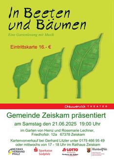 Die Lesung "In Beeten und Bäumen" ist eine Kooperationsveranstaltung des Chawwerusch Theaters, der Bürgerstiftung Pfalz und der Initiative Offene Gärten Pfalz. Die Veranstaltungsreihe wird gefördert vom Kultursommer Rheinland-Pfalz, die Aufführung in Zeiskam zusätzlich durch die Thüga. Die Karte kostet 16 € und ist im Rathaus in Zeiskam zur Sprechstunde mittwochs von 17-18 Uhr erhältlich sowie unter der Nummer 0175-4669549 reservierbar.