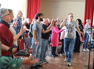 Voller Vertrauen in seinen Chor hatte er mit „Praise“ ein extrem schwieriges Stück ausgesucht, dessen Strophen er selbst sang. „Lord hold me“ war einigen Teilnehmern schon bekannt, so dass es der Chor recht schnell beherrschte. Ein Teilnehmer konnte diesmal die Darbietung mit einem zu Herzen gehenden Solo bereichern. „Kyrie Eleison“ hat für Hans-Jörg Fiehl eine besondere persönliche Bedeutung und es bedeutet ihm viel, es mit dem Chor zu singen.